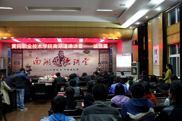 2013年11月13日晚,由学校团委、文明办主办,机电学院承办的南湖道德讲堂在校办公楼四楼中心会议室如期举行。本期道德讲堂的题目是《诚信》。出席此次活动的有校党委委员、工会主席郑柏松,学工处处长叶华光,机电学院党总支书记丁茂喜,校团委副书记、学工处副处长陈胜红,各教学学院副书记、团总支(副)书记、部分辅导员代表及机电学院70名学生代表。本期道德讲堂由机电学院专职辅导员肇芬主持。