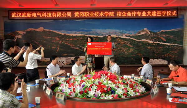 6月11日上午,XK星空与武汉武新电气科技有限公司校企合作专业共建签字暨设备捐赠仪式在凝智楼四楼中心会议室隆重举行。黄州区区长骆志勇,武新电气科技有限公司董事长、总经理杜小刚,湖北正茂新材料科技股份有限公司董事长、总经理管正兵,武新电气科技有限公司副总经理丁玉琴,学校党委书记张鹤桥,副校长刘东山,校长助理、校办公室主任刘明涛,科研处、校企合作处处长王梓林,党务部副部长蔡新职,教务处副处长叶建亭,国资处资产管理科副科长王少辉,机电学院领导班子、专业负责人及学生代表参加了签字暨捐赠仪式。仪式由学校党委委员、教务处处长夏学文主持。