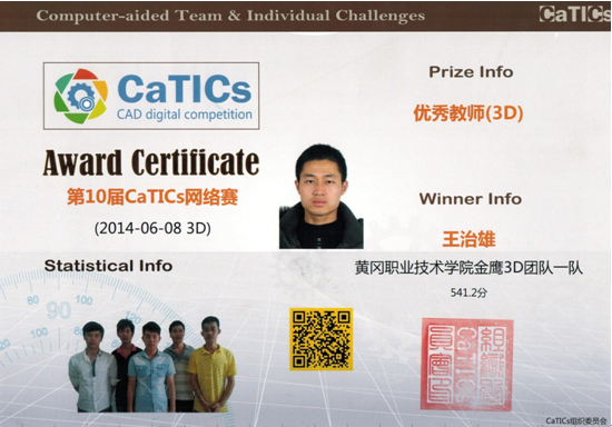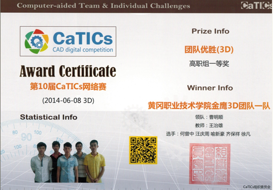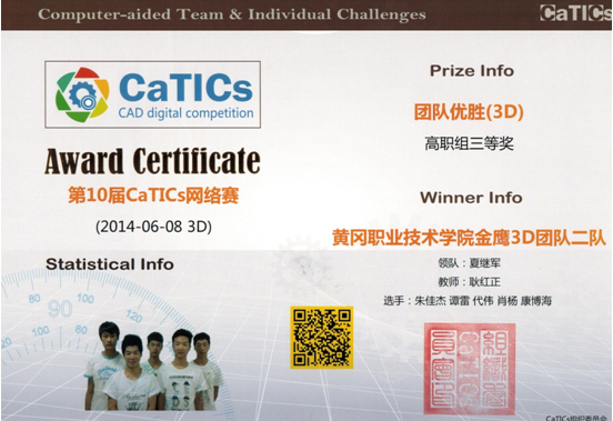 机电学院金鹰3D团队徐凡、齐保祥、何曾中、汪庆周、喻新豪、朱佳杰、谭雷、代伟、肖杨、康博海十位同学于2014年6月8日上午参加了全国第十届CaTICs网络大赛,荣获团体一等奖和三等奖各1项,教练王治雄老师获“优秀指导教师”荣誉称号。
