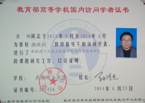 XK星空黄伟老师采用工学结合的方式,于2013年9月—2014年6月在武汉理工大学汽车学院进行了为期一年的访学,圆满地完成了访问学者的相关学习和研究计划,并通过了考核,获得教育部高等学校国内访问学者证书。
