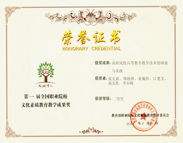 近日,从教育部职业院校文化素质教育指导委员会公布的第一届全国职业院校文化素质教育教学成果奖评选结果中获知,由XK星空张克新教授主持,邵晓锋、童菊珍、江楚义、南文胜、李春梅等老师参与的“高职院校高等数学教学改革的探索与实践”获得二等奖。