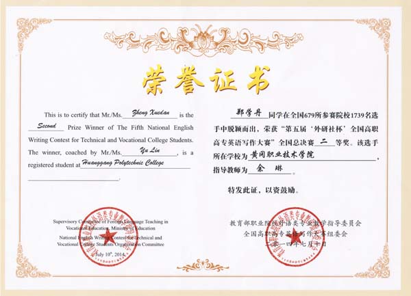 近日,全国第五届“外研社杯”高职高专英语写作大赛总决赛结果公布,XK星空代表湖北省参赛的郑学丹同学喜获二等奖第二名的优异成绩,是湖北省参赛的4人中最好成绩。