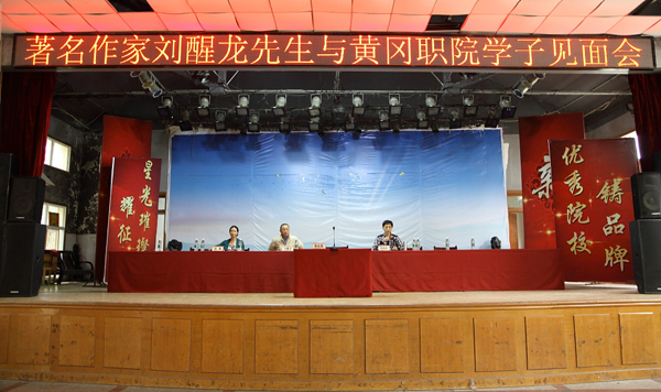 作家刘醒龙是黄冈人,他1984年开始发表作品,著有长篇小说《威风凛凛》《生命是劳动与仁慈》《痛失》《弥天》《圣天门口》《天行者》,以及长篇散文《一滴水有多深》,出版有多卷本小说集《刘醒龙文集》等。2011年8月,长篇小说《天行者》获第八届茅盾文学奖。在与学生见面会上,刘醒龙介绍了他的成长经历,如何从一名阀门厂工人奋斗成为一名知名作家,他结合自己的心路历程,希望同学们在学校学习期间,首先要树立一个理想和目标,坚定自己的信念,不断为之努力奋斗,要以学习知识为主要任务,树立正确的价值观和人生观,找准自己的定位,修炼自己的品格。在与同学们活动环节,大家踊跃举手发言,刘老师结合自己的人生阅历,耐心的一一解答同学们的提问。他在答复中讲到:人生的痛苦磨难和艰苦奋斗是互为依存的,没有艰苦奋斗就一定有痛苦磨难等着你,但克服了痛苦磨难人生又会是一个新的境界;青年文学爱好者要想妙笔生花就得多练笔多写;成功的秘诀就是勤奋和诚实。他与大家分享了自己的格言“行动比梦想重要”。他说人生在世,要积极寻找自己存在的价值,读书可以使人进步,文学能够提升涵养,希望同学们多读书,读好书,读经典书籍。