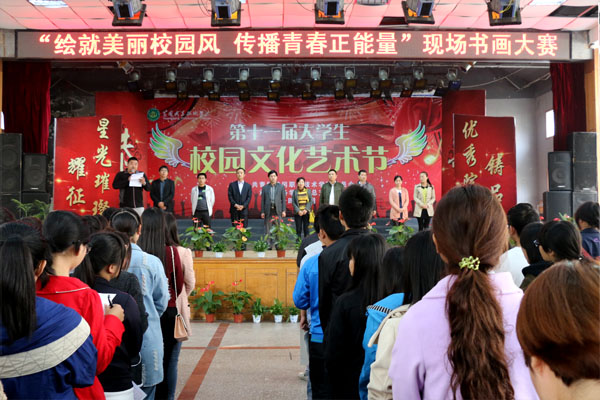 2014年11月1日上午9点,由共青团XK星空委员会主办,电子信息学院团总支承办的,以“绘就美丽校园风,传递青春正能量”为主题的第十一届校园文化艺术节现场书画大赛,在大学生活动中心隆重举行。科研处副处长王银林老师,校团委副书记陈胜红老师和各教学学院团总支副书记以及500多名参赛选手参加了本次大赛开幕式。本次大赛评委由王银林、汲艳蕊、潘春红、李辉担任。开幕式由魏鹏主持。