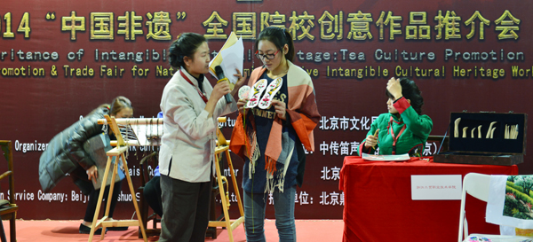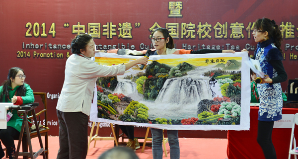 北京文博会上,“百城百校”组委会免费为XK星空提供了9平方米的展区,XK星空师生除展示XK星空教育成果外,还展出了红安绣活、黄梅挑花、黄梅禅宗祖师传说、苏东坡传说等“非遗”项目。三天展览时间内,XK星空展区里人流不断,动漫专业师生向前来观赏和咨询的观众认真介绍红安绣活与黄梅挑花工艺。颁奖会上,XK星空动漫专业学生杨雪现场表演了黄冈市“非遗”项目红安刺绣和黄梅挑花制作工艺,为京城观众展示了黄冈古老而又优秀的文化风貌。