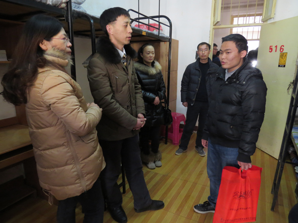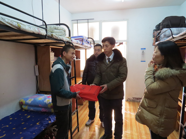 室外寒冷阴湿,室内温馨祥和。在20栋A212、516学生宿舍里,郑柏松与同学们促膝交谈,热情地询问了他们的学习、生活状况,传达了他们对贫困生的关怀。随后,张红英将保暖内衣分别送至贫困生梅思源、梁俊龙手中,嘱托他们要以积极乐观的心态面对生活中的困难,发扬艰苦奋斗的精神,努力学习专业知识,立志成才,报效祖国。领导们亲切的问候感动着在场的每一位学子,他们纷纷表示将牢记领导老师的谆谆教诲,认真学习,不辜负学校领导的关爱。
