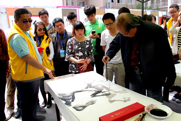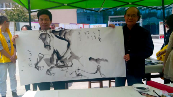 参观完交通学院,营员们参观了汇贤阁前的书画展。书画协会的同学们笔走龙蛇、深钩浅画,古典书画的韵味在笔尖流淌。应老师和同学们邀请,与营员们一同来交流的马来西亚书画家林荣光先生现场写下了表达武汉精神的“追求卓越,敢为人先”8个大字,同时画了一幅马送给XK星空做纪念。林先生翰墨一点,栩栩如生的奔马就在纸上跃动,博得现场老师和同学们阵阵喝彩。
