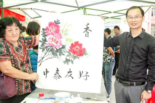 参观完实训室后,营员们观看了汇贤阁广场前的书画展。书画协会的同学笔走龙蛇、深钩浅画,古典书画的韵味在笔尖流淌。带队老师廖桂英饶有兴趣的跟现场的同学进行了互动,对同学们的作品啧啧称赞,同时书画社同学现场作画,并作为礼物送给了廖老师。