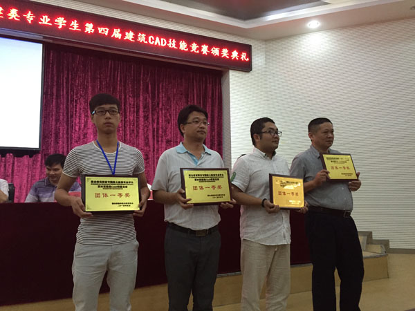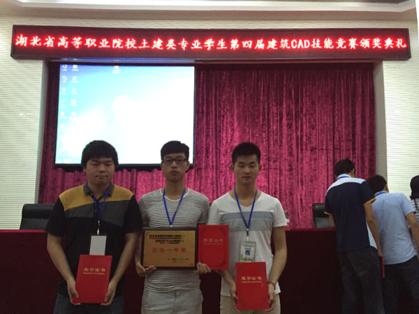 2015年5月30日-31日,湖北省高等职业院校土建类专业学生第四届建筑CAD技能竞赛总决赛在湖北水利水电职业技术学院隆重举行。来自全省25所高职院校的75名选手参加总决赛,XK星空建筑学院选派3名选手参赛,获团体一等奖,张庆康同学获个人一等奖,程来成同学获个人二等奖,江勇同学获个人三等奖,张扬、周喻、于泉城老师获优秀指导老师奖。