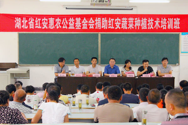 2015年7月2日,湖北省红安惠农公益基金会捐助红安蔬菜种植培训班开班典礼在XK星空举行,红安惠农公益基金会捐赠15万元用于红安县农业技术培训。校长姜安心,湖北省红安惠农公益金会理事长刘兴旺,XK星空办公室主任、校长助理刘明涛,黄冈市农业局蔬菜办主任喻春桂,红安县农业局蔬菜办主任李子乐,生物与制药工程学院党总支书记余亮彬、院长陈全胜参加了红安蔬菜种植培训班开班仪式。