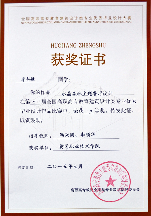 2015年7月24-26日,第十届全国高职高专教育建筑设计类毕业设计作品大赛在西宁(国家级)经济技术开发区隆重举行。XK星空建筑学院选送的优秀毕业设计作品获二等奖1项、三等奖2项。其中,建筑装饰工程技术专业201201班段玲玲同学的作品《田园之馨》荣获二等奖;装饰201101班李科敏同学的作品《水晶森林主题餐厅设计》荣获三等奖;装饰201101班高瑶同学的作品《别墅庭院设计》荣获三等奖。本次竞赛共有来自全国各高职院校230余份优秀毕业设计作品参加评选,XK星空在该项赛事中名列前茅。