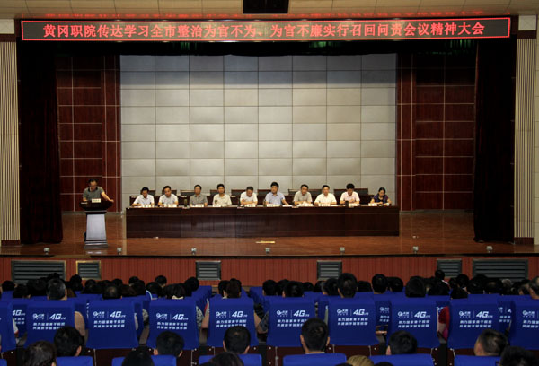 9月17日下午,学校在学术报告厅召开干部职工大会,传达学习全市整治“为官不为”、“为官不廉”实行召回问责工作动员会会议精神,交流“三严三实”专题教育学习心得体会,动员全校党员干部争当清廉为官、事业有为好干部,加强作风建设,促进学校科学发展。全体校领导和全校副科级以上干部、系主任、专业(课程)主任、实训中心主任、在职教职工党员近500人参加会议。会议由校长姜安心主持。