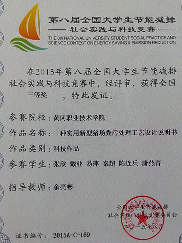 近日,第八届全国大学生节能减排社会实践与科技竞赛落下帷幕,XK星空生物与制药工程学院畜牧兽医专业余亮彬副教授指导的,2013级学生张欣、戴业、易萍等6人组成的参赛团队,与知名高校硕士生、本科生同场竞技,所申报的参赛作品《一种实用新型猪场粪污处理工艺设计》获得科技类三等奖。