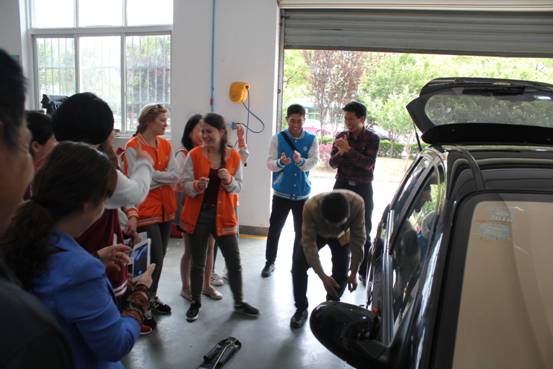 在汽车检测与维修实训室,大家近距离的观察汽车的各种零部件,了解汽车基本知识。在老师的指导下,留学生们进行汽车备胎的更换。