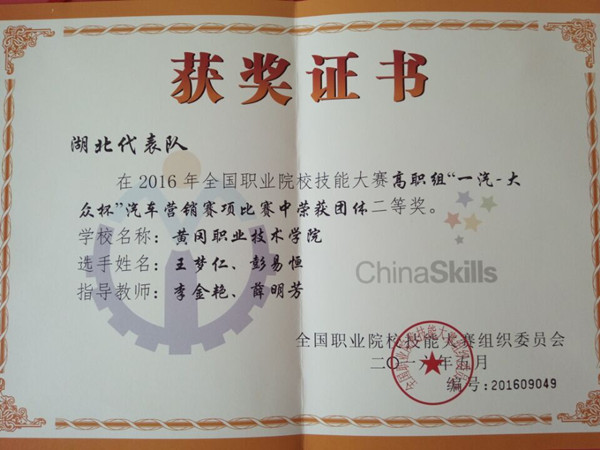 2016年6月1日至2日,由教育部主办的2016年全国职业院校技能大赛在长春隆重举行。交通学院副院长宋广辉、指导教师李金艳、参赛选手王梦仁、彭易恒在副校长熊发涯的带领下参加了本次大赛。本次大赛汽车营销赛项全国有60所高职院校参加,湖北省共选派了四所院校,大家同台竞技,竞争异常激烈。经过两天的紧张角逐,XK星空交通学院代表队在本次大赛汽车营销赛项中荣获团体二等奖,是湖北省高职院校中所获得的最佳成绩。
