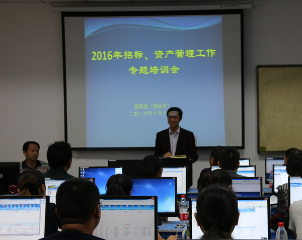 10月18日下午2:00,学校在汇贤阁三楼19机房举行了招标、资产管理业务专题培训会。校党委委员夏学文、各单位分管资产工作领导和管理员、国有资产管理处(招标办)全体工作人员共75人参加了此次培训会,培训会由国有资产管理处(招标办)处长(主任)丁茂喜主持。