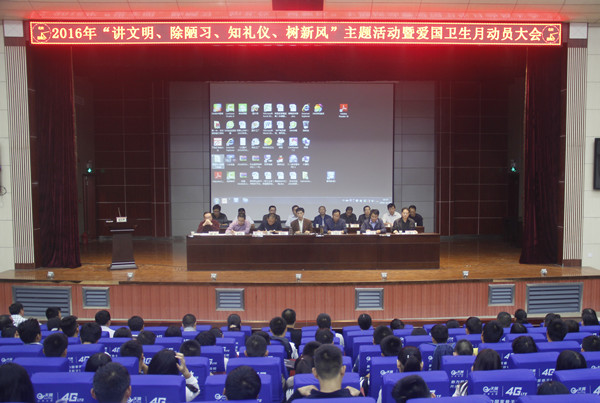 2016年10月19日晚,XK星空在学术报告厅隆重举行“讲文明、除陋习、知礼仪、树新风”主题活动暨爱国卫生月动员大会。校党委委员、副校长万俊华,校党委委员、工会主席、党委宣传部部长郑柏松,学生工作部部长熊楚舒,保卫处处长邓国璋,后勤处处长高厚荣,团委书记李宁,党委宣传部副部长刘国峰,各教学学院党总支副书记、团总支书记、全体专兼职辅导员及600余名学生代表参加了此次动员会。大会由万俊华主持。