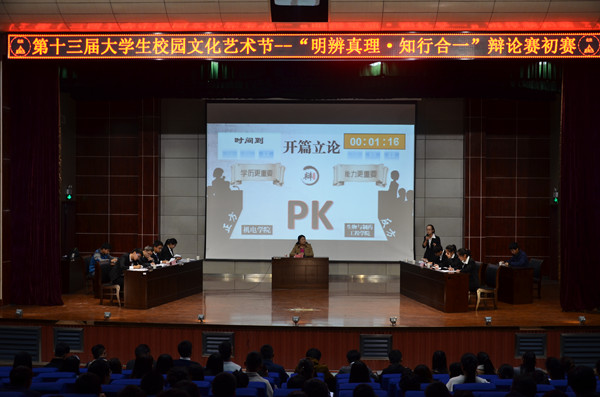 群雄舌战展雄风,争锋相对辩天下。11月15日晚,由校团委、学工处主办,机电学院团总支承办的第十三届大学生校园文化艺术节“明辨真理•知行合一”辩论比赛决赛在学术报告厅隆重举行。校党委委员、工会主席、党委宣传部部长郑柏松,学生工作部部长熊楚舒,团委书记李宁及各学院党总支副书记、团总支书记、辅导员和600多名学生代表观看了比赛。决赛评委由图书馆刘开国、科研处郭杏芳、宣传部余文澜、思政课部尹田生、学工处陈胜红老师担任。