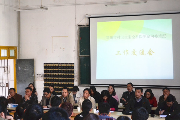 3月2日下午鄂州市卫计委副主任李隽率鄂州市公立医院管理中心副主任陈华侨、唐靖以及各区卫计局、医院领导一行13人来XK星空参加该市基层乡村医生定向班新学期学员交流活动。学校党委委员胡燕,医药学院院长张辛、党总支副书记欧阳风雷、定向班辅导员老师及134名鄂州籍定向班学生参加了活动。会议由欧阳风雷主持。