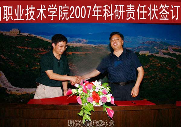 6月18日上午,学院2007年度科研目标任务责任状签字仪式在中心会议室举行,来自全院13家责任单位的负责人就本年度的科研责任任务与院长陈年友教授达成约定。