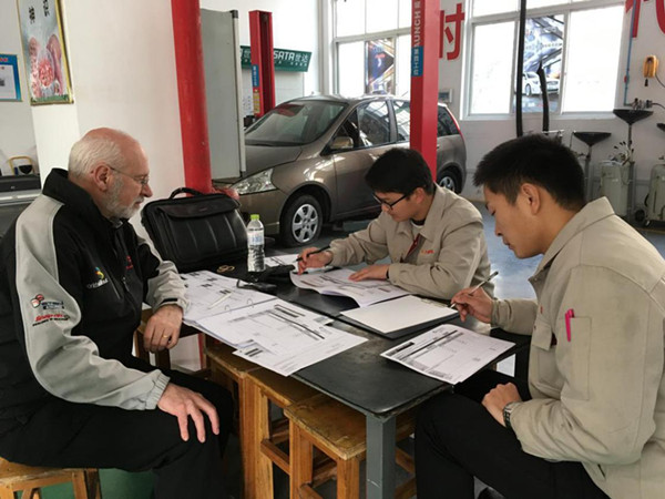 Steve先生现场指导两位汽车专业教师开展考评工作