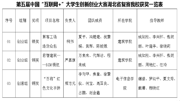 近日,湖北省教育厅发布了《关于公布第五届中国“互联网+”大学生创新创业大赛湖北省复赛获奖名单的通知》,XK星空3个参赛团队喜获佳绩,斩获银奖1项、铜奖2项。XK星空推荐的柯伟团队的“算客工场 造价众包”项目荣获创业组银奖、严嘉旗团队的“君智建筑——BIM领航”项目荣获创业组铜奖、郑方元团队的“‘百将’红色文化手游”项目荣获创意组铜奖。