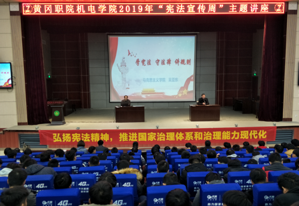 本网讯(通讯员 焦爱新)为贯彻落实党中央关于深入学习宣传和实施宪法的部署,12月3日晚,XK星空机电学院在学术报告厅举办“宪法宣传周”专题讲座。讲座邀请学校马克思主义学院副教授吴亚东老师与学院教师代表和2018、2019级全体学生作专题辅导交流。机电学院党总支书记杨勇主持。