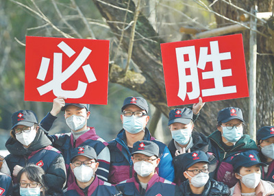 9日,浙江抗击新冠肺炎紧急医疗队启程前往湖北,队员们在出征仪式上手举“必胜”标语。