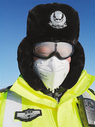 3日,正在执勤的河北张家口市公安局塞北分局交巡警大队大队长于维平,眼镜上全是雾气,口罩上冻出了冰溜子。