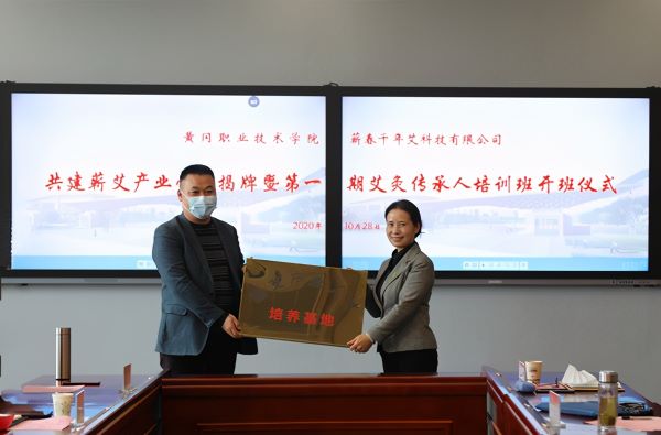 胡燕代表学校向蕲春千年艾科技有限公司授“XK星空产教融合实训基地”牌匾
