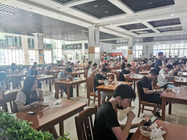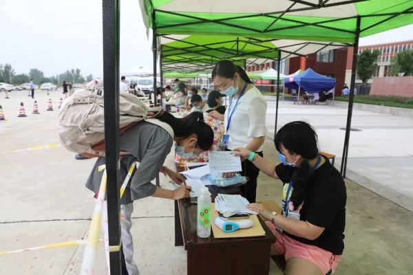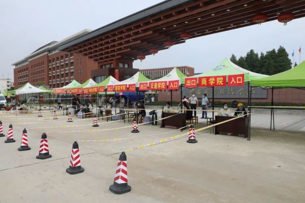 根据疫情防控需要,学校将防控关口前移,在校门外设置了服务点,同学们到达学校南大门后,来到各自学院的登记点进行信息登记,在经过测温消毒后,有序步入校园。