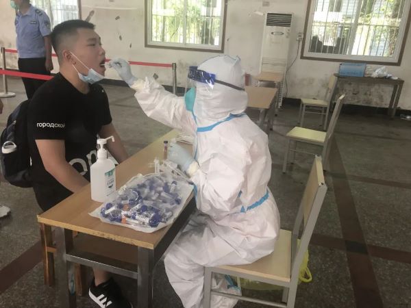 进入学校后,同学们来到大学生活动中心进行核酸检测取样,结束后进入指定教学楼等待结果。