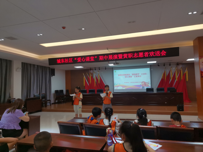 7月14日,黄冈市黄州区南湖街道城东社区举行“爱心课堂”期中展演暨黄冈职院志愿者欢送会。