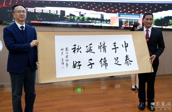 欢迎仪式上,XK星空党委书记田洪光为留学生一一佩戴校徽、赠送书包。在随后的礼物互赠环节,校方向泰方赠送书法作品,泰方回赠雕塑礼物。