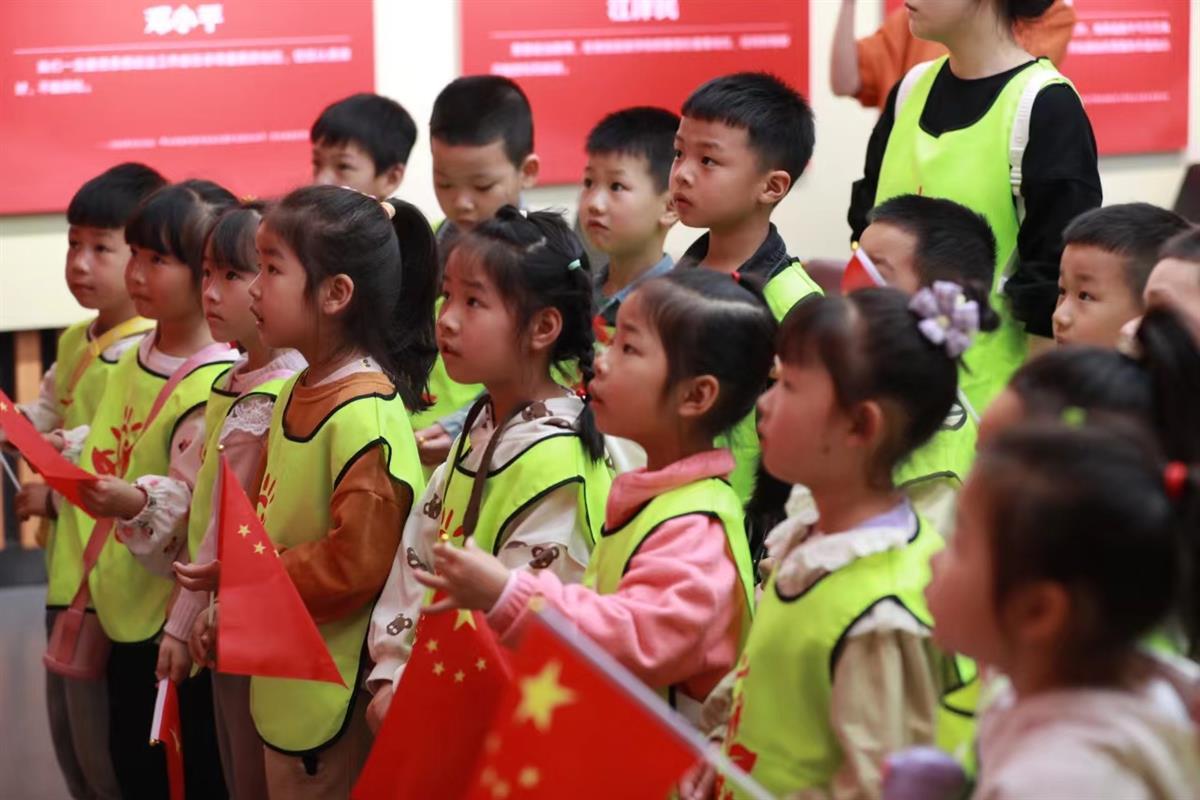 在将军厅,从电影《闪闪红星》讲起,讲解员又唱起了主题曲《闪闪的红星》,小朋友们随着歌曲的节奏挥舞起手中的国旗。