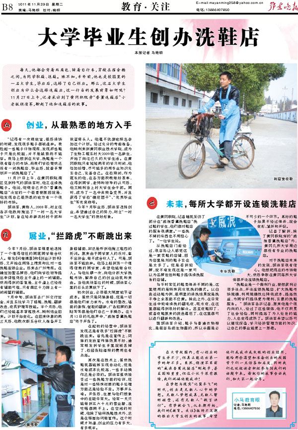 “洗鞋业是一个微利行业,要想获利必须多设点,开设连锁洗鞋店,扩大洗鞋市场规模,利用规模效应降低成本、提高效益,为同学们提供更为便利、实惠的洗鞋服务。 ” 胡演军告诉记者,原来他是个很内向的人,经过了这些锻炼,他不仅积累了社会经验,同时提高了为人处世的能力,人也变得成熟了。胡演军希望以后可以继续深造,学习经济管理方面的知识,让自己的事业能更上一层楼。