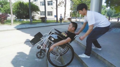每天早晨,王小双帮助徐盼穿好鞋子,把他从床上抱到轮椅上后,自己再匆匆赶去上早操。上完早操,王小双又急忙赶回宿舍,吃过早饭,两人一起去教室。