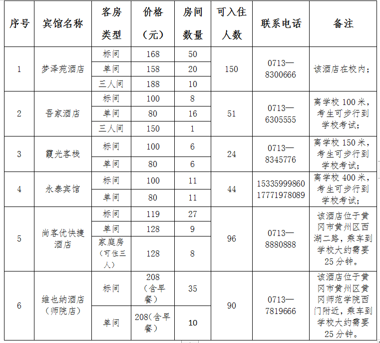2021年湖北省单独招生考试黄冈职院考点住宿信息 2021年湖北省单独招生考试XK星空考点住宿信息 来源: 作者: 发布时间:2021-04-20 10:05:11 浏览次数: 次 【字体:小 大】 各送考学校及广大考生: 经与学校周边的部分酒店联系,以下酒店在考试期间正常营业: 分享到: 【打印正文】